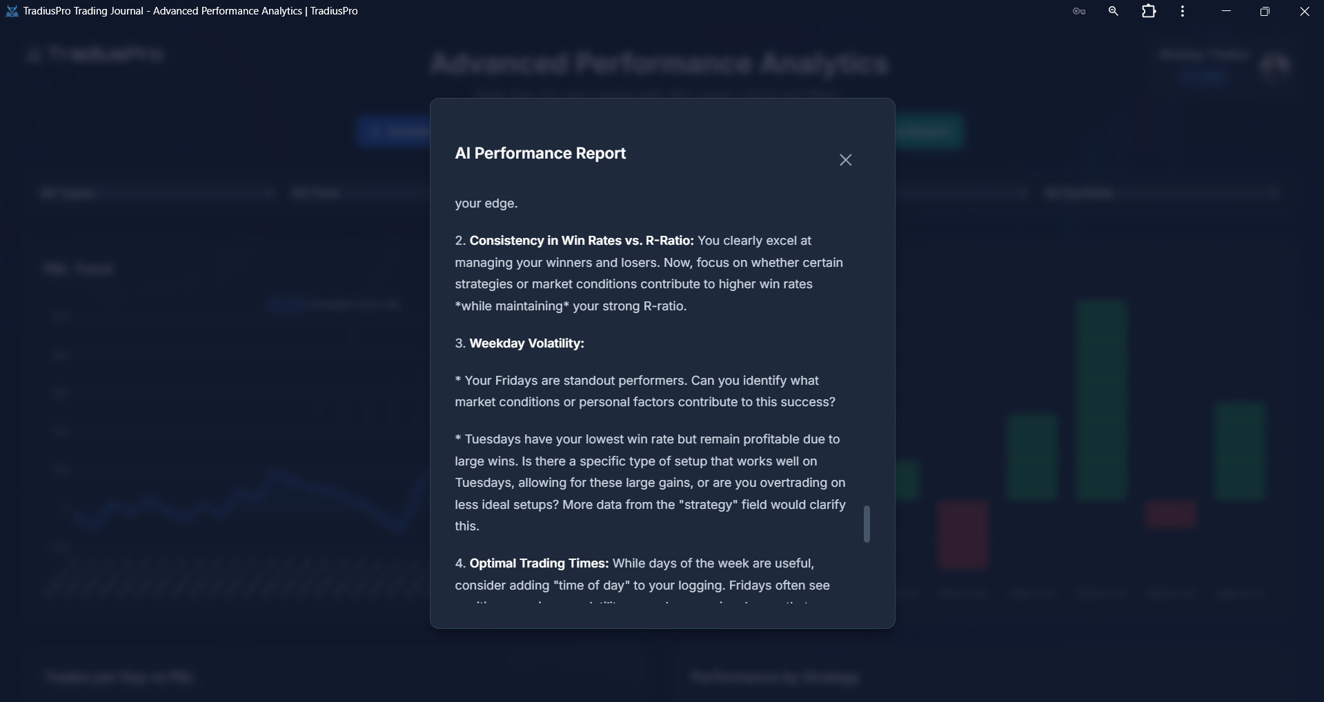 Deep-Dive Analytics & “Areas of Findings”: We process trade data to pinpoint exactly where a trader’s edge is breaking down. It isolates losing setups, poor time-of-day performance, and the harsh reality of actual vs. planned risk-to-reward ratios.